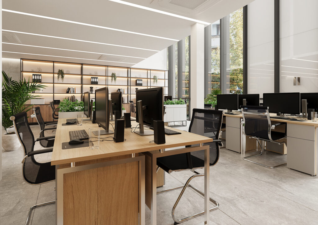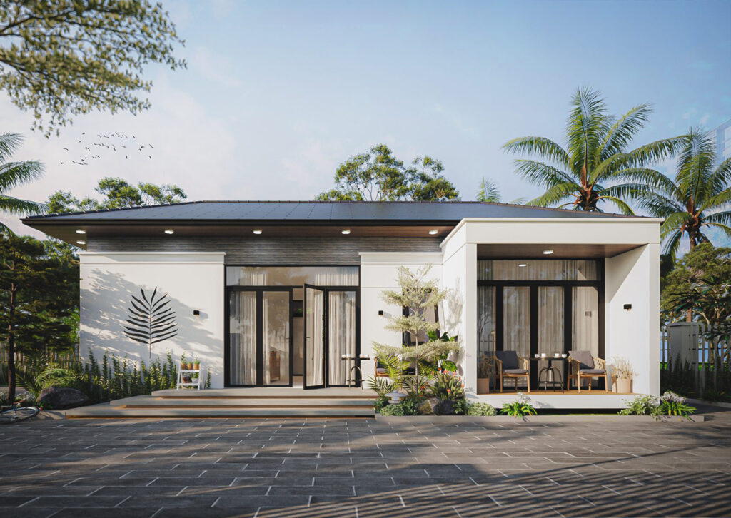 Một biệt thự hiện đại rộng rãi với cửa sổ kính lớn và cảnh quan tươi tốt.